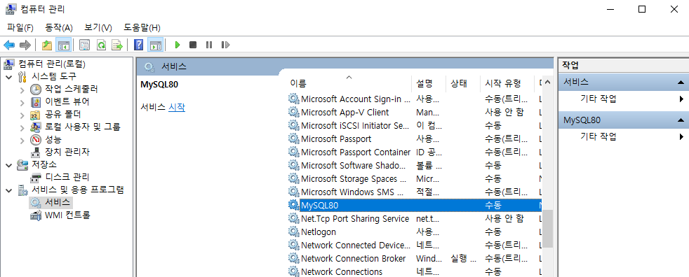 돋보기-[컴퓨터 관리]-[서비스 및 응용 프로그램]-[서비스]-[MySQL80]-[오른쪽버튼:시작]